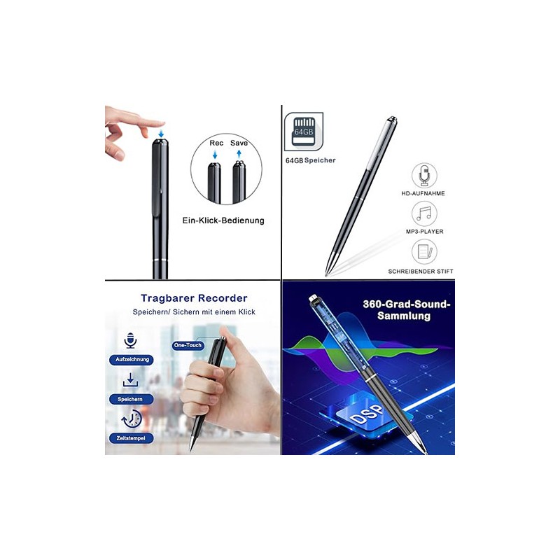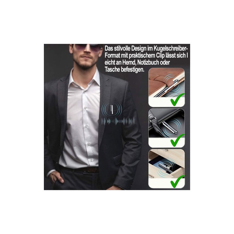 Ein Spionage-Recorder im eleganten Kugelschreiber-Design – diskret, funktional und leistungsstark. Mit riesigem Speicher, HD-Aufnahmequalität und Sprachaktivierung ist er das ideale Werkzeug für alle, die Gespräche zuverlässig und unauffällig dokumentieren möchten.
